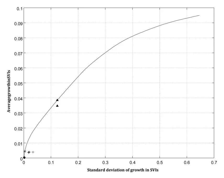 Fig. 3. Sharpe Ratio Heuristic of Keyword Risk-Adjusted Performance for the Internet sector Note: This figure displays the risk (standard deviation in popularity growth) on the x axis and the expected return (average popularity growth) on the y axis for the Internet sector. The solid line is the efficient keyword frontier, the filled circle and the star are the minimum variance and the maximum Sharpe ratio portfolios on the efficient frontiers, the crosses are the five benchmark portfolios and the triangles are the Sharpe ratio heuristic portfolio and the efficient portfolio for the respective level of risk.