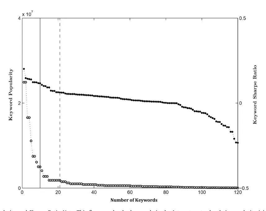 Fig. 4. Rank of Keywords by Popularity and Sharpe Ratio Note: This figure ranks the keywords in the Internet sector by their popularity (circles, left y axis) and their Sharpe ratio (filled circles, right y axis). The vertical dotted line separates head from long tail keywords while the vertical solid line demonstrates the 10 keywords with the highest Sharpe ratio.