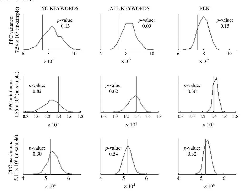 Section titled “4.1. Model Selection”We use a predictive approach to assess model fit and to determine model selection. Specifically, we base our analysis on the posterior predictive distribution using so-called posterior predictive checks (PPCs).16 Calculating PPCs requires generating predicted (or replicated) data sets based on the proposed model and the parameter estimates. Comparing these predictions to the observed data is generally termed a posterior predictive check (e.g., Gelman et al. 1996, Luo et al. 2008, Braun and Bonfrer 2010, Gilbride and Lenk 2010). PPCs offer certain advantages over standard fit statistics. First, a wide range of diagnostics can be defined based on the distribution of predictions under a model. Second, posterior predictive simulation explicitly accounts for the parametric uncertainty that is usually ignored by alternative approaches. Using PPCs we can not only evaluate whether a proposed model provides the best fit compared with other models but we can also investigate whether the proposed model adequately represents the data. However, model checking by means of PPCs is openended, and gold standards have yet to be established (Gilbride and Lenk 2010). We use PPCs to investigate model fit in-sample as well as model predictive power out-of-sample.