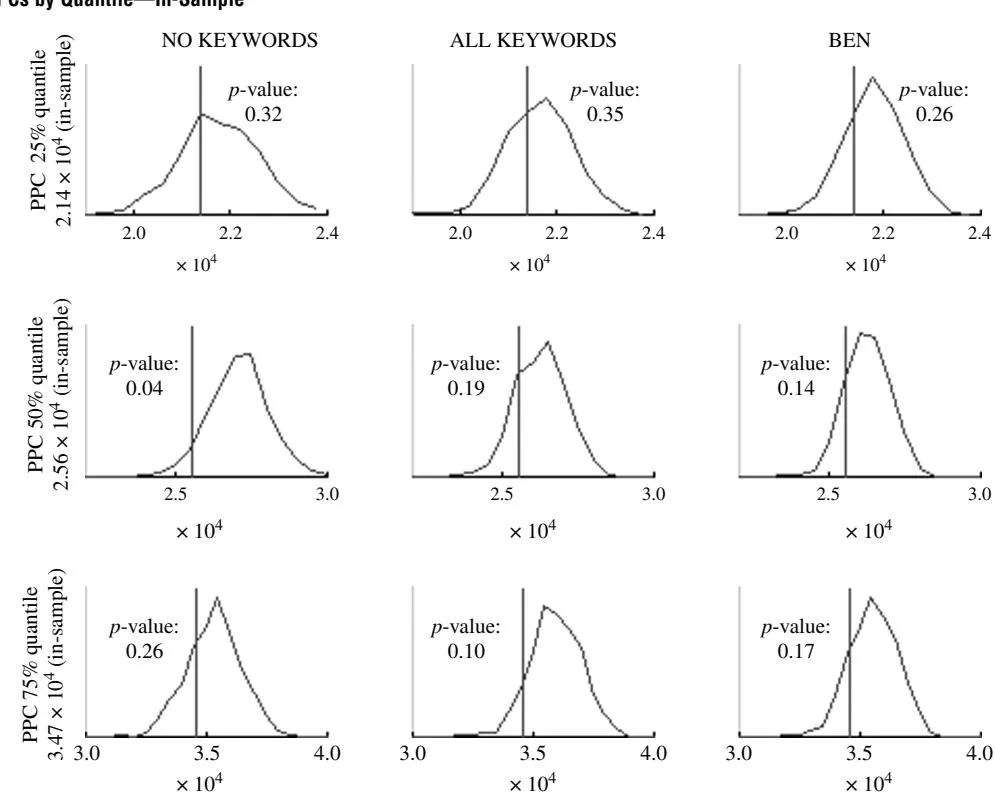 We close our investigation with an analysis of the factors associated with keyword effectiveness. We propose an original approach to generate semantic characteristics based on a given set of keywords. We use a novel hierarchical setup to include semantic keyword characteristics into our keyword-level model. First, we find evidence that the previously documented value of brands in keywords extends from direct to indirect effects. Second, for our focal firm, broader keywords, which are generally more expensive because of higher levels of competition, are better at producing return visitors compared with narrow keywords. Our findings have the potential to change campaign strategy, which at many firms is targeted toward the long tail and finding “diamonds in the rough.” Our analysis shows that broad keywords have additional indirect effects that narrow keywords seem to lack. Thus, our model allows managers to determine which keywords are likely candidates to produce strong indirect effects and to consider this when determining the firm’s paid search strategy.