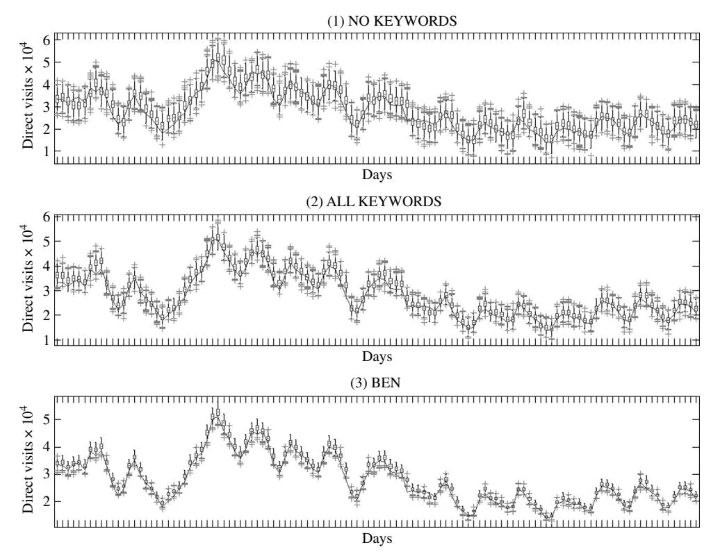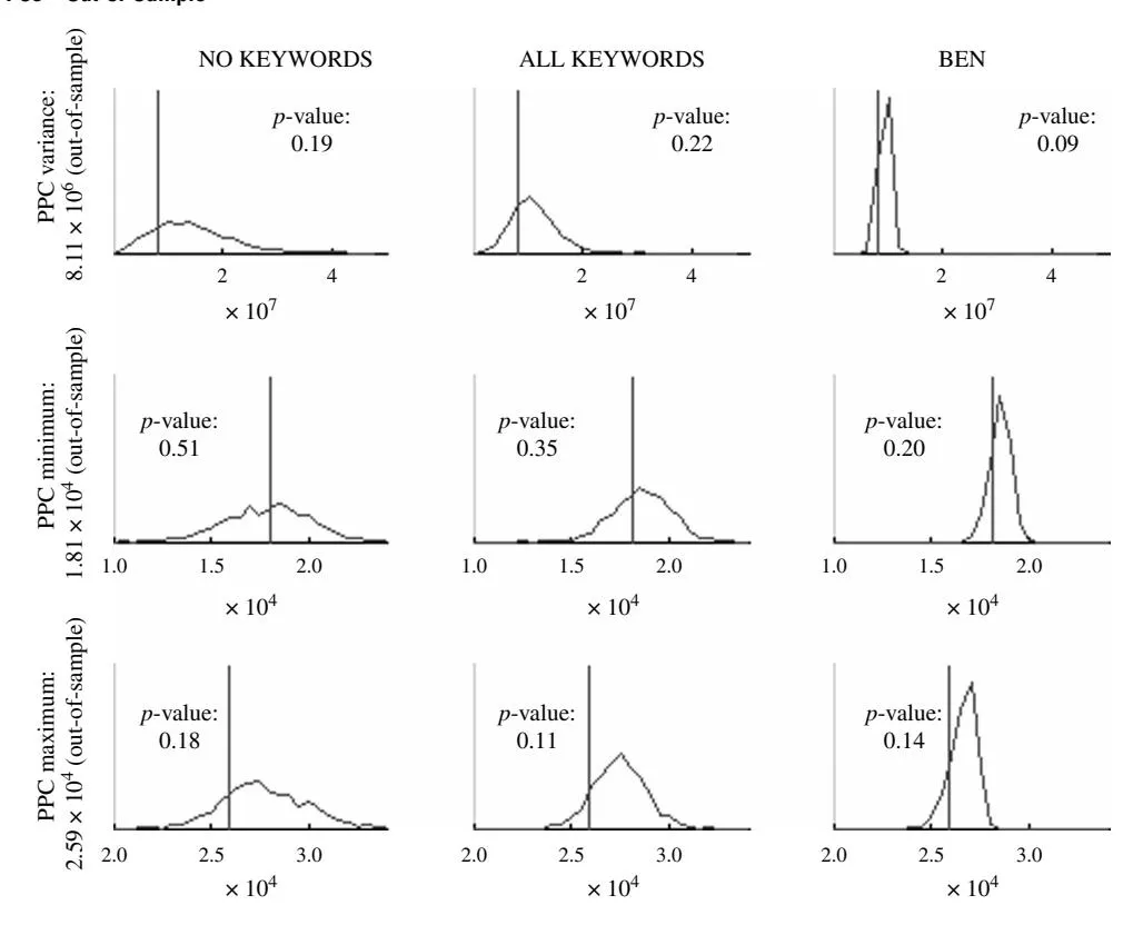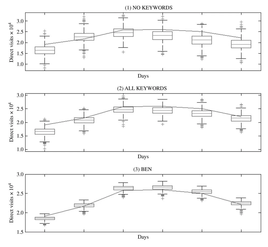 Section titled “2.4. Model Comparisons”We compare our proposed model against two benchmarks. First, we model direct type-in visits without including paid search as an explanatory variable (NO KEYWORDS). This is implemented by estimating Equation (1) without PsV. Second, we model direct type-in visits assuming all keywords have the same (homogeneous) effect, i.e., setting k = 1∀k (ALL KEYWORDS). Our proposed model follows the specification described in Equations (1)–(4) above and is labeled BEN. Moving from NO KEYWORDS to ALL KEYWORDS enables us to assess the presence and magnitude of the indirect effect but at an aggregate (across all keywords) level. Moving from ALL KEYWORDS to BEN enables us to determine the keyword-level effect on direct type-in visits and the value of modeling the indirect effect on a keyword level.