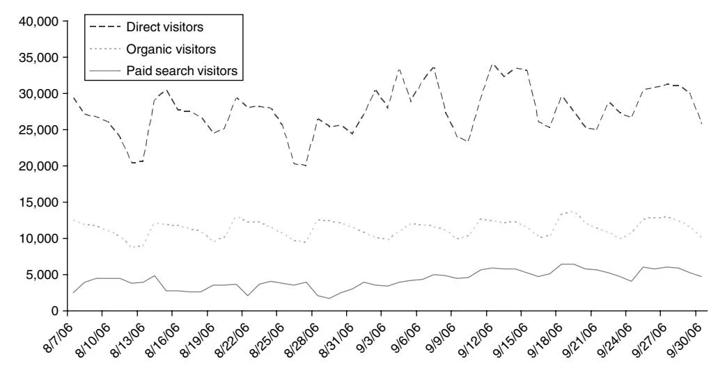 Section titled “3.1. Data Set Description”Our empirical application is based on a data set from a commercial website in the automotive industry.10 Almost all commercially available cars and light trucks are offered, prices are fixed (no haggling policy), and consumers can either order their new cars online or obtain referrals to a dealership. The company also brokers after-market services such as financing and roadside assistance. The data set spans 117 days, from May to September 2006. The company tracks how visitors come to its website: typing in the URL or using a bookmark (direct type-in visits per day, DirV), clicking on an organic search result (organic visits per day, OrgV), or clicking on a paid search result (paid search visits per day, PsV). The majority of the visits to the site (see Figure 1) are direct type-in visits (63%, daily average of 30,669 visits). Organic visits account for 27% of the traffic (daily average of 13,248 visits), and paid search visits account for 10% (daily average of 4,791 visits). Note that the company focused its advertising