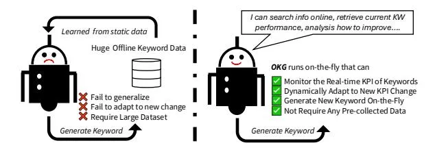 In this paper, as shown in Fig 1, we propose OKG, an LLM agent-based approach to SSA keyword generation that addresses the limitations of previous methods. Unlike these approaches, OKG continuously learns and evolves by observing the performance of generated keywords in live campaigns, enabling it to dynamically identify trends and optimize keyword selection. The original contributions of OKG are summarized as follows:
