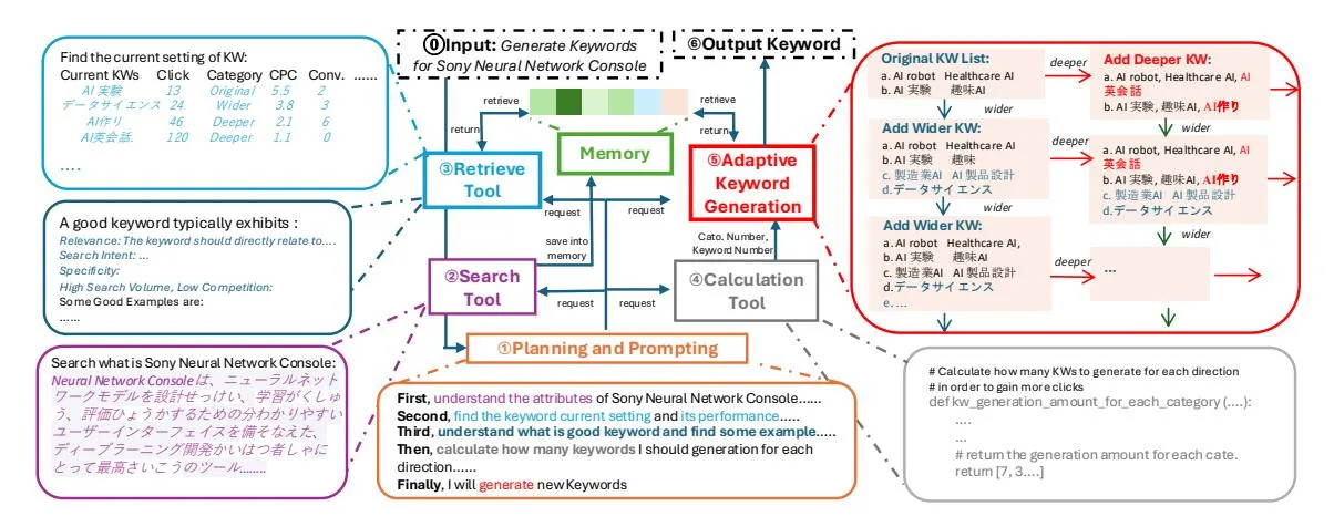 Section titled “4.1 Key Components of OKG”Planning and Prompting: OKG simplifies keyword generation by eliminating the need for advertisers to gather training data or train models themselves. With just an initial prompt—“You are the expert in setting Japanese SSA keywords for {product}“—where the {product} placeholder is replaced by the specific item, OKG can automatically generate relevant keywords. This setup allows advertisers to focus on strategic elements of their campaigns, while OKG manages the technical complexities. By leveraging vast offline data, the system quickly produces high-quality keyword sets tailored to the product, reducing the cognitive load for users.