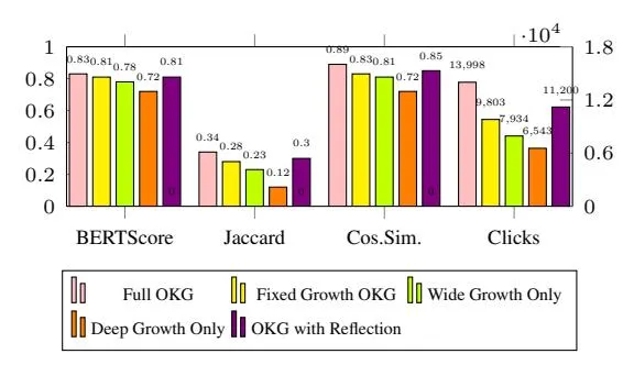 Figure 3 shows the performance across key metrics, highlighting that the Full OKG consistently outperforms the other versions. Fixing the growth directions in the OKG with Fixed Growth version results in a notable performance decline. Both Wide Growth Only and Deep Growth Only confirm that neither exploration nor exploitation alone is as effective as their combination. Interestingly, OKG with Reflexion (Shinn et al., 2024), which learns from past experiences, does not yield improvements in keyword relevance, supporting our hypothesis that real-time feedback monitoring is more critical than relying on past data.