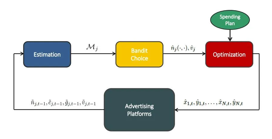 Section titled “2.2. Learning Problem Formulation”In concrete scenarios, the functions nj (·, ·) and the parameters vj in the optimization problem stated in Equations (1a)–(1d) are not a priori known, but they need to be estimated online. Thus, an algorithm needs to gather as much information as possible about these functions during the operational life of the system, and, at the same time, not to lose too much revenue in exploring suboptimal bid/daily budget allocations (a.k.a. exploration/exploitation dilemma). Thus, our learning problem can be naturally formulated in a sequential decision fashion [33] as a Combinatorial Semi Bandit problem (CSB) [28]. 8 In the CSB framework, at every round, the learner chooses from a finite set of options, called arms, a subset of these, called superarm, subject to some combinatorial constraints (e.g., knapsack constraints). Subsequently, the learner observes the payoffs of every single arm belonging to the chosen superarm and gets the corresponding reward. In the optimization problem stated in Equations (1a)–(1d), each arm corresponds to a bid/daily budget pair, each superarm corresponds to a collection of pairs, one per campaign, and the constraints consist in satisfying the overall daily budget constraint and the range constraints for the bid and daily budget. The payoff of every arm is the revenue we obtain by setting a bid/daily budget pair.