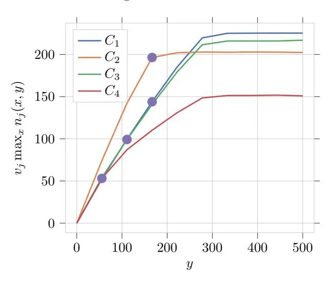 click monotonically increases in x and, therefore, e sat j (x) monotonically reduces in x. Finally, fixed the value of x, the number of clicks increases linearly in the daily budget y, where the slope is the number of clicks per unit of daily budget e sat j (x), until the maximum number of clicks n sat j (x) obtainable with bid x is achieved. For the sake of clarity, we report in Figure 1 an example of function nj for four values of bid; the black dashed curve depicts maxx∈X{nj (x, y)} as the daily budget y varies.
