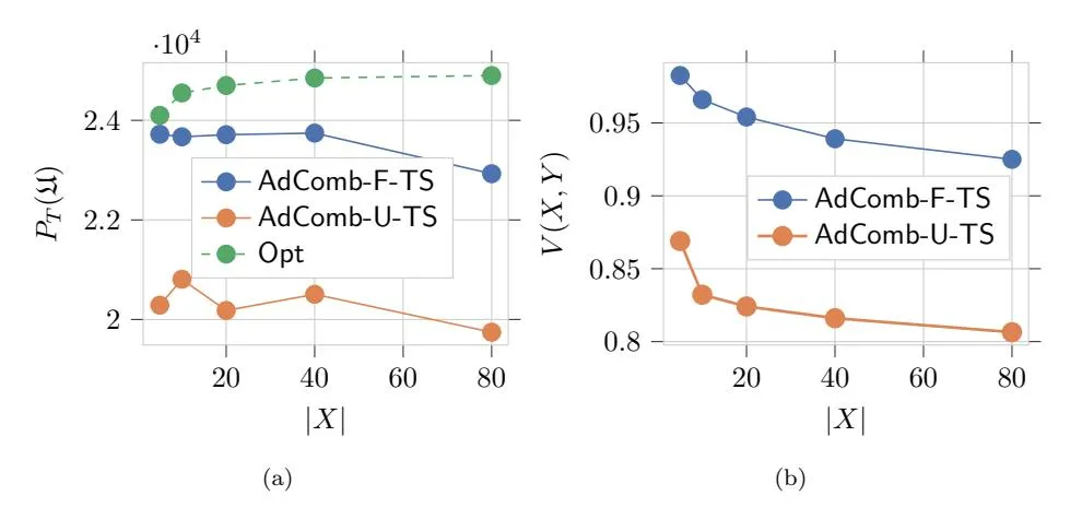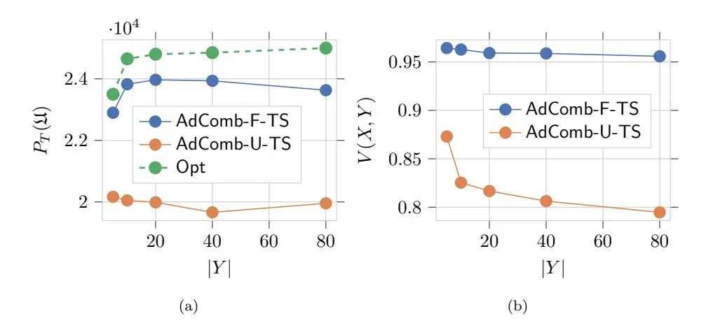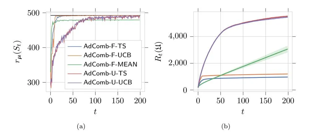 Table 3: Results for Experiment #3: performance of algorithms AdComb-F-TS, AdComb-F-UCB, AdComb-U-TS, AdComb-U-UCB with 10 different random settings at round t ∈ {25, 50, 100}.