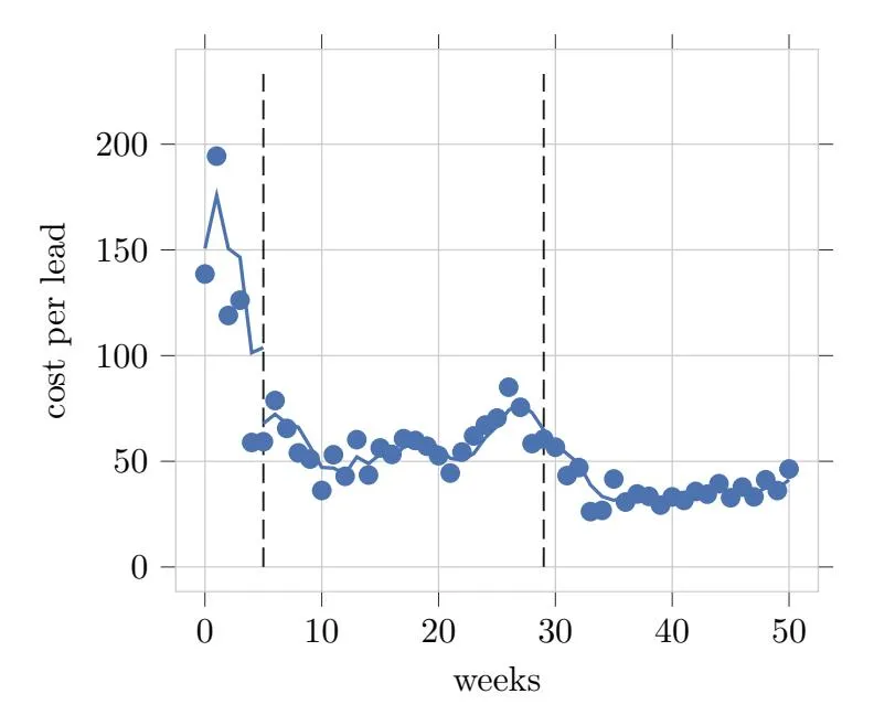 The actual cost per week, differently from the cost per lead, was subject to prominent oscillations. These oscillations were due to seasonability and the possibility of overspending on the platform (i.e., even if the platforms allow the introduction of daily budget constraints, these constraints can be violated by the platforms). The evaluation of the performance of our algorithm was very positive for the company, as to motivate its adoption for other sets of campaigns.