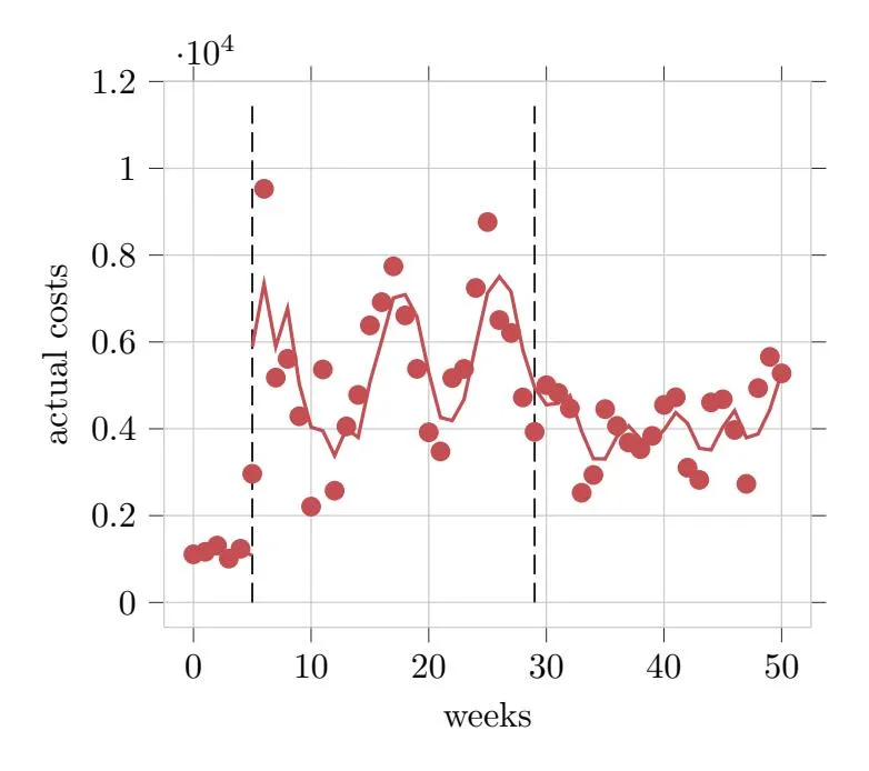 The cost per lead and the actual costs per week are reported in Figures 8 and 9, respectively. The cost per lead dramatically reduced thanks to the activation of algorithm at the 6th week, from an average of about 120 Euros per lead to about 65 Euros per lead. Furthermore, the algorithm spent about 4 weeks to reduce the cost per lead from about 65 Euros (at the 6th week) to about 50 Euros (at the 10th week). The algorithm exhibited a rather explorative behavior until the 15th week due to the need to collect samples, whereas, from the 16th week to the 26th week, the algorithm presented a rather stable behavior. Notably, even if the algorithm was rather explorative up to the 15th week, the performance in these weeks was evaluated rather stable by the human specialists. The oscillations from the 15th week to the 28th week were due to seasonability effects and the campaigns of the competitors. More precisely, the human specialists confirmed that from the 12th week (beginning of September, corresponding to the conclusion of the summer holidays in Italy) to the 18th week (middle of October), the users are usually less interested to make loans. This behavior leaded to an increase of the cost per lead. A similar effect was