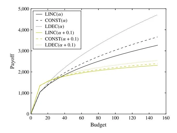 Figure 4 shows the payoff at different budget caps with these three forms of advertising effort elasticity and also the corresponding results when is increased by 0.1.