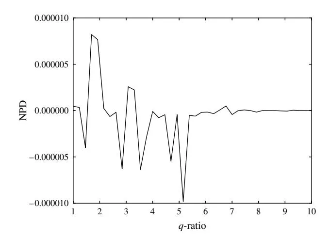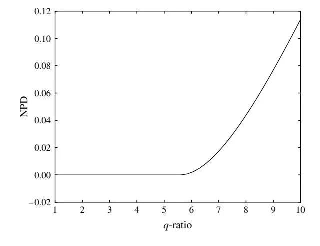 As shown in Figure 8, in Case 3b there exists an interval (1 ≤ q1/q2 ≤ 6) where q-ratio has a negligible effect (NPD ≈ 0). However, q begins to increasingly influence the optimal budget strategy when q1/q2 ≥ 6. This implies that q has some effect on the optimal budget strategy only when its ratio across markets is large enough to influence the market share in the situation where C is large.
