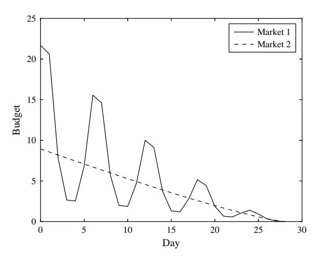 Figure 6 Optimal Budget Allocated in Two Search Markets Over Time in Case 2b