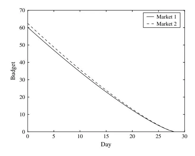 Figures 5 and 6 illustrate the optimal budget allocated to the two search markets over time under these two cases, respectively. When the two markets have the same (Figure 6), the optimal budgets allocated to the two markets are almost the same. When the two markets have different (Figure 5), the optimal budgets allocated to the two markets are significantly different. As the advertiser’s elasticity experiences ups and downs over time, so does the budget allocation. Thus, we can draw the conclusion that the advertising effort elasticity has a significant influence on the optimal budget allocation in the two markets.