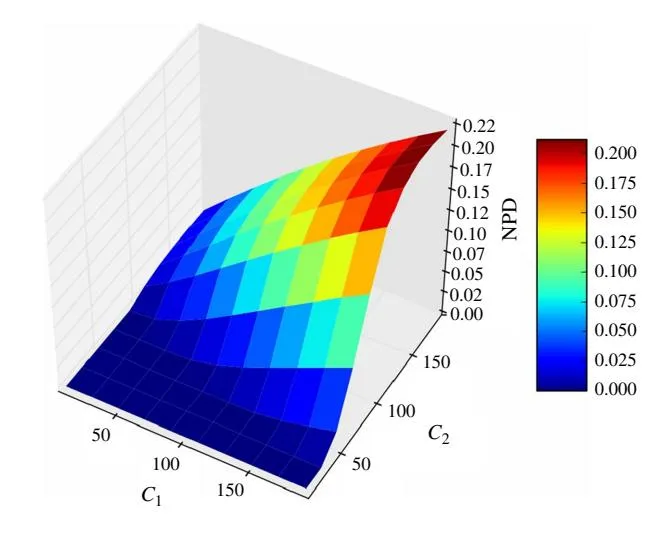 Figure 10 (Color online) The Normalized Performance Difference with Varying C1 and C2