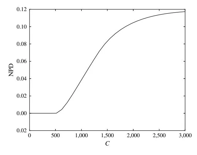 Different C Value0 As shown in Figures 7 and 8, different C values do have some effect on the payoff. In this experiment, we want to study how the change in C affects the NPD. We increase C1 and C2 together while keeping C1/C2 = 3. Figure 9 shows the NPD with C1 increasing from 0 to 3,000.