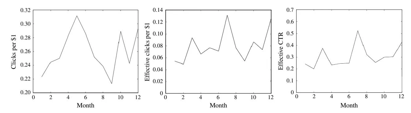 - Because of the proprietary nature of search engine operations, it is impossible to obtain the quality score (q) directly from the advertiser. In this work we take the CTR as the quality score in the comparison experiment. In practice, we can also measure the relevance between the ad text and the corresponding landing page, between the keyword and the ad text, between the keyword and the query using text mining techniques (e.g., Raghavan and Hillard 2009). An advertiser’s quality score can then be approximated as the product of her CTR and the relevance factors. In the situation with stable advertising performance, the quality score’s amplitude of variation is quite small. Therefore, it can be treated as a constant during a given promotional period.