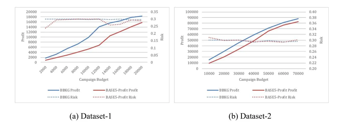 Figure A3. Profit and Risk for Risk-Averse Advertisers ( = . ) over Campaign Budget by BBKG and BASE5-Profit
