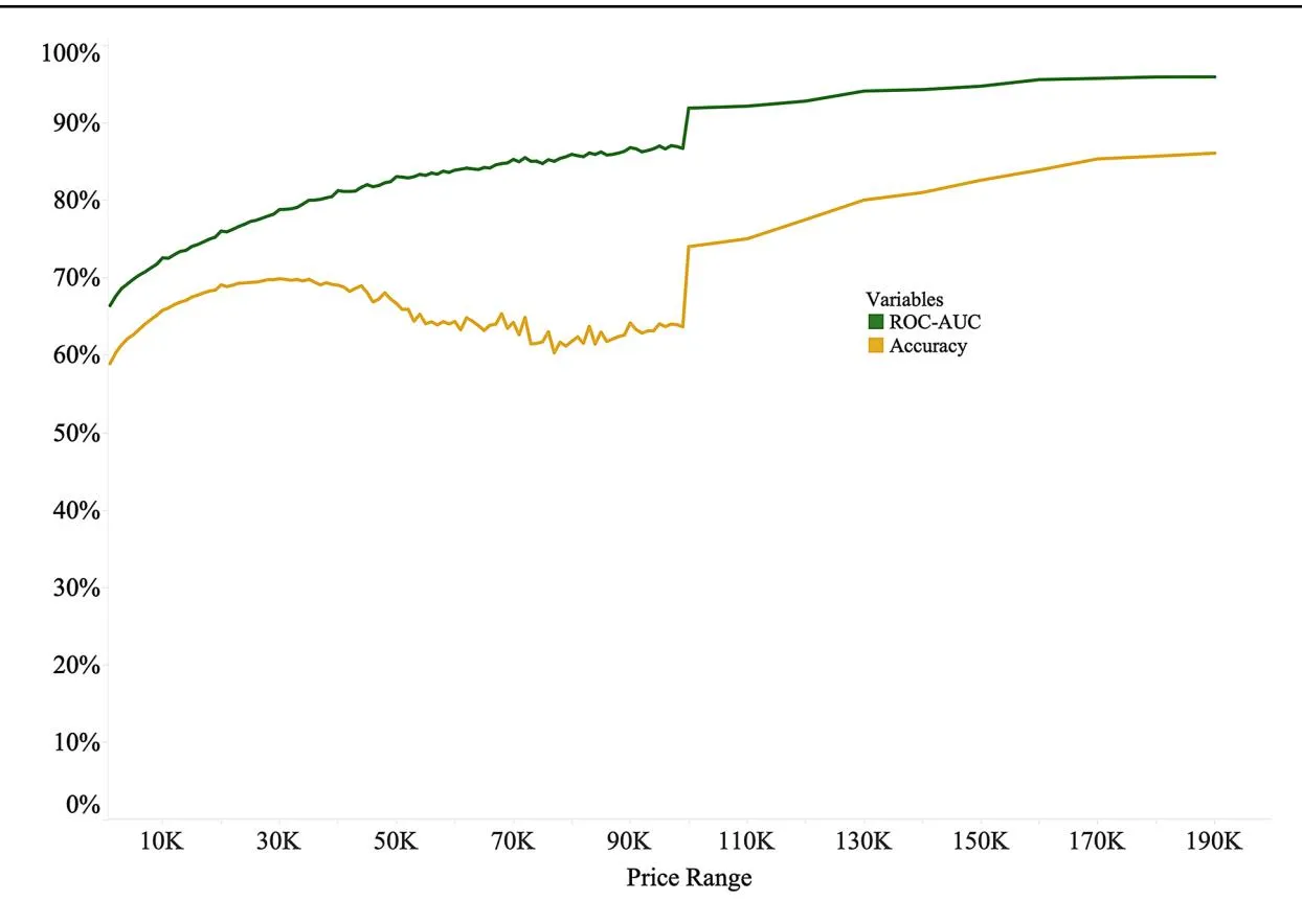 To further validate the loss of explanatory power in higher price segments, we conducted additional analyses by adjusting the sentiment scores calculated using word frequency. These adjustments, such as logarithmic transformations and scaling, consistently show diminishing relevance to product sales as prices increase above ¥100,000. This result is consistent with findings from the consumer behavior literature, where higher financial stakes increase the importance of emotional and trust-building cues in purchase decisions, which traditional models fail to account for adequately. To ensure that the loss of explanatory power in the high-price segment is not due to the size of the scores, we performed further analysis by reducing the proportion of the scores calculated by word frequency to approximate the scores calculated by SATORE. Figures 11 and 12 show the logarithm of the sentiment scores and direct division by 1000, respectively, to investigate the effect of these modifications on the logistic regression model results.