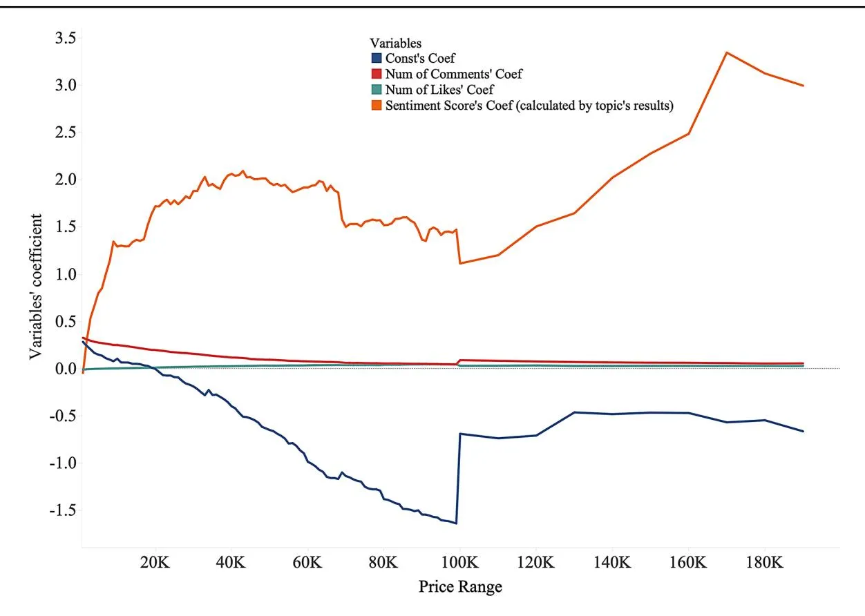 Fig. 10 Sentiment score coefficients across different price ranges. The red box highlights the threshold of ¥100,000, where the sentiment score shows a significant shift in its impact on purchase intentions