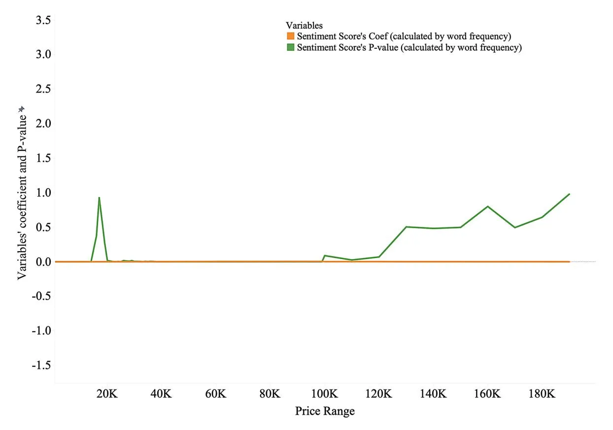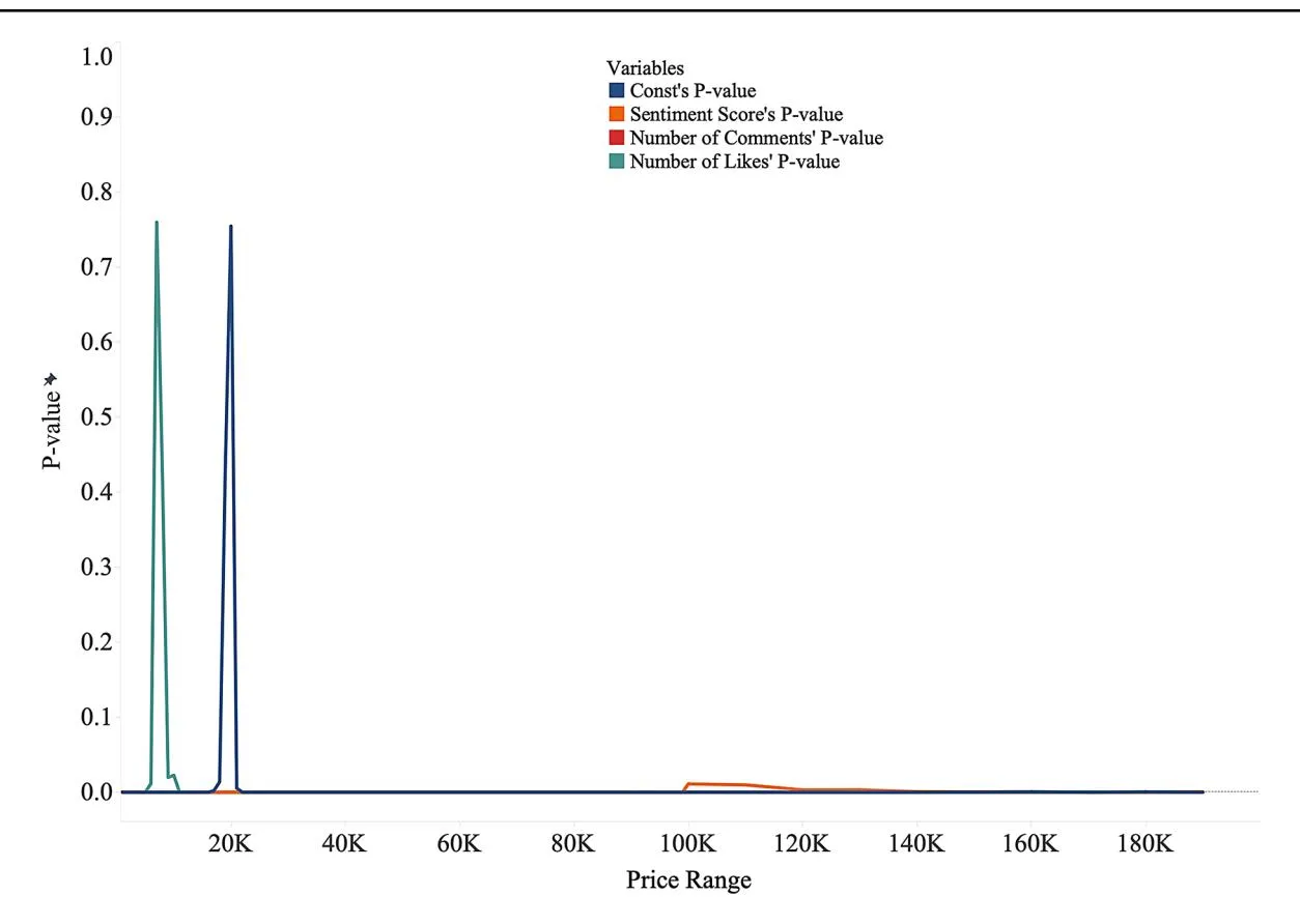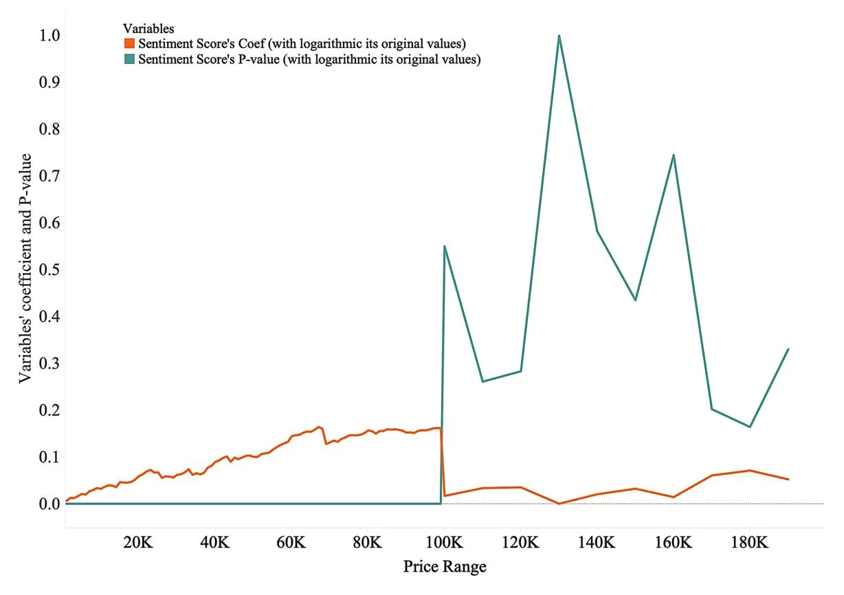 Figure 10 shows the P-values of the sentiment scores calculated using word frequency. Our analysis reveals that word-frequency-based sentiment analysis loses explanatory power at higher price ranges, particularly beyond the ¥100,000 threshold, and becomes insignificant at ¥130,000. Thus, while a higher standard error signals more variability in the relationship between sentiment and purchase intentions, this does not invalidate our conclusion. Instead, it highlights the nuanced nature of high-value purchases, in which emotional cues in product descriptions play a more pronounced but less consistent role. In high-value transactions, buyers are often influenced by rational evaluations (e.g., price and