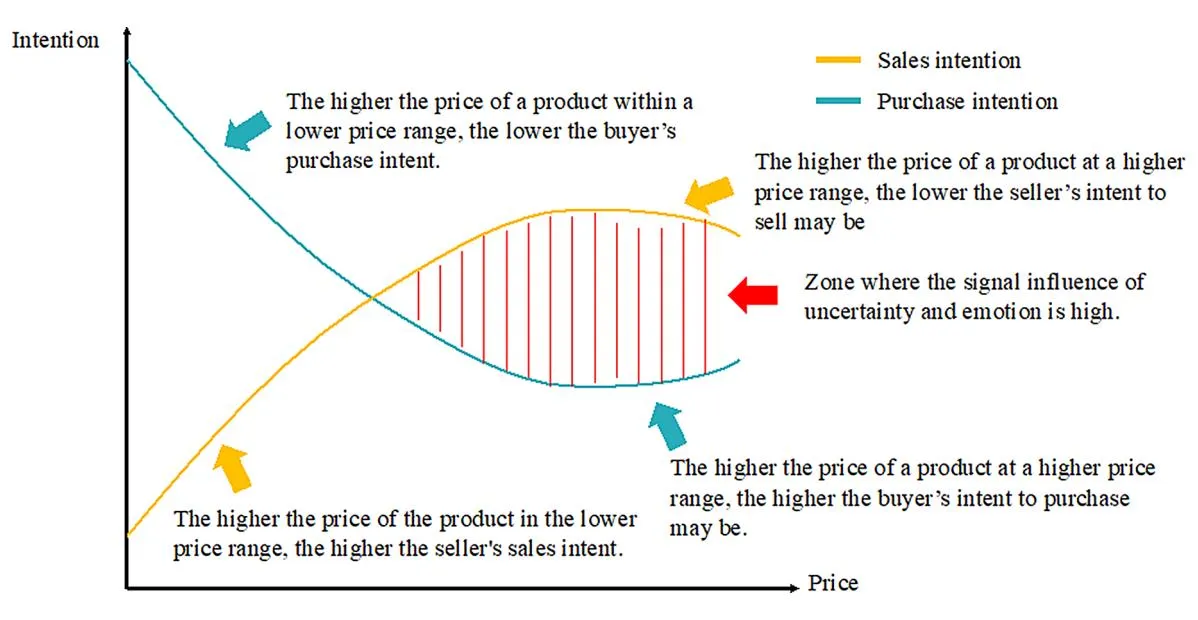 Emotional elements in product descriptions, especially for high-priced items, have emerged as critical factors influencing consumer trust and purchasing decisions. Figure 9 visually demonstrates a theoretical model of how sentiment and price dynamics may influence a buyer’s purchase intentions and seller’s behavior in high-value transactions. In this model, “sales intention” represents a hypothetical concept based on a seller’s anticipation of the market conditions and price movements. This reflects a seller’s potential willingness to delay or expedite the sale of an item depending on the product’s price. For example, sellers may be more inclined to sell quickly at lower prices, anticipating stable or declining prices. Conversely, sellers may become more reluctant to sell at higher prices, expecting the product’s value to rise further, leading to higher returns. This theoretical concept is not directly measured but interprets seller behavior based on price fluctuations.
