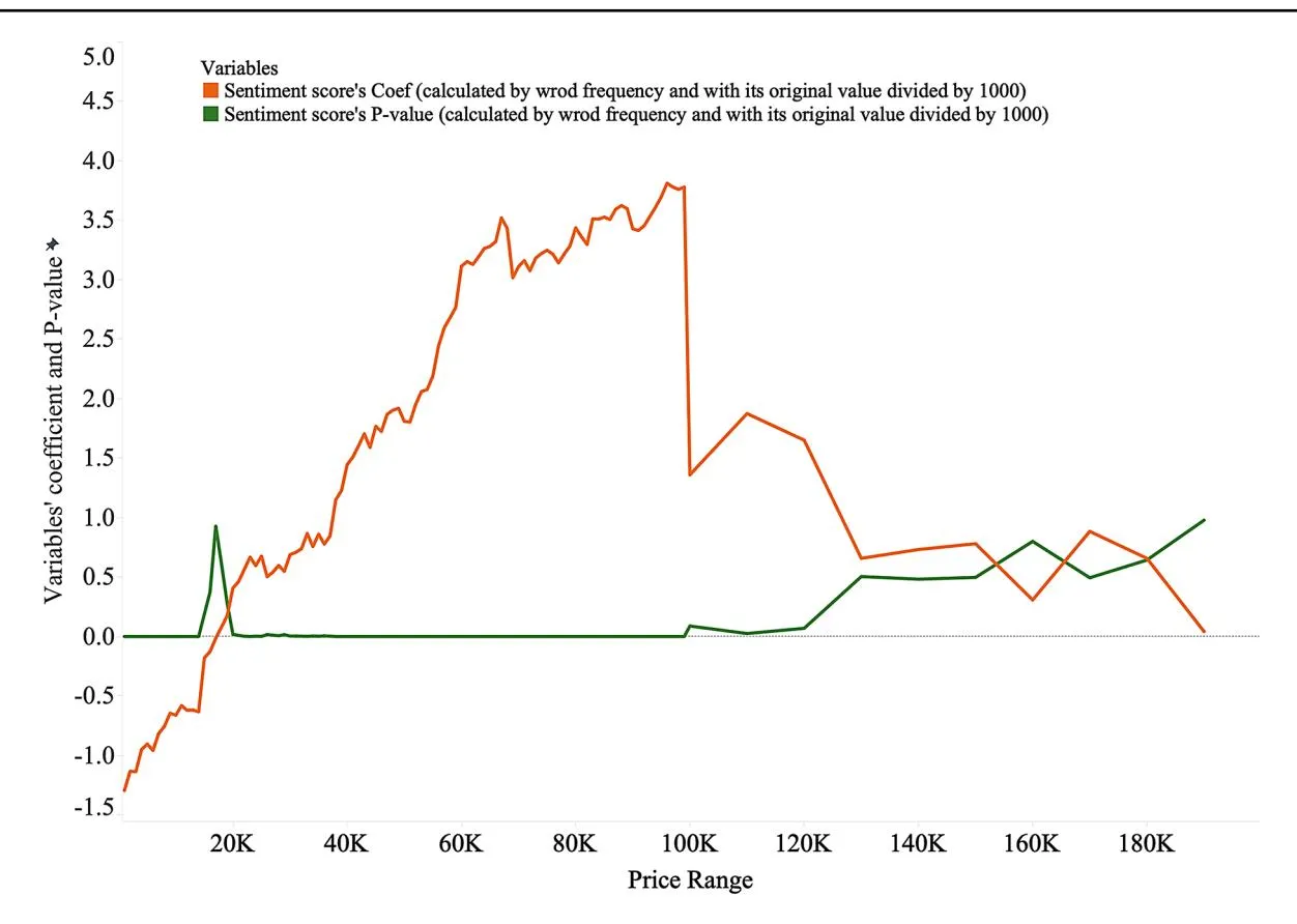 product specifications) and emotional engagement, which may shift the weight of emotional factors relative to other decision-making elements. The high standard error reflects greater variability in how different buyers respond to sentiment cues, suggesting that sentiment remains a significant driver with varying degrees of influence depending on the specific transaction. This result suggests that the usefulness of the sentiment scores calculated using word frequency is limited to a certain price range. Comparing the results from Figs. 6 and 7, we can conclude that sentiment scores calculated through SATORE are more effective than those calculated through word frequency, which do not vary with price and lose explanatory power in the high-price segment.