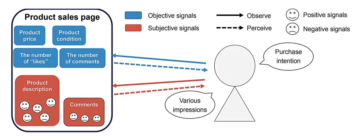 Signals in e-commerce are characterized by observability and cost [5]. Observability refers to how noticeable the signal is to outsiders, such as potential buyers, whereas signal cost refers to the effort or resources required to produce the signal [5]. For example, research has shown that higher website quality, as a signal, increases trust and purchase intention, particularly in high-value transactions. Thus, they rely on quality signals to perceive the quality of a product [6, 15, 16]. If sellers can send quality signals, the information will help buyers reduce information asymmetry and build trust, leading to purchase intention. For instance, Gregg and Walczak (2010) demonstrate that, as a signal, the higher website quality, the greater the likelihood of trust, purchase intention, and price premium sellers will receive from potential buyers [6].