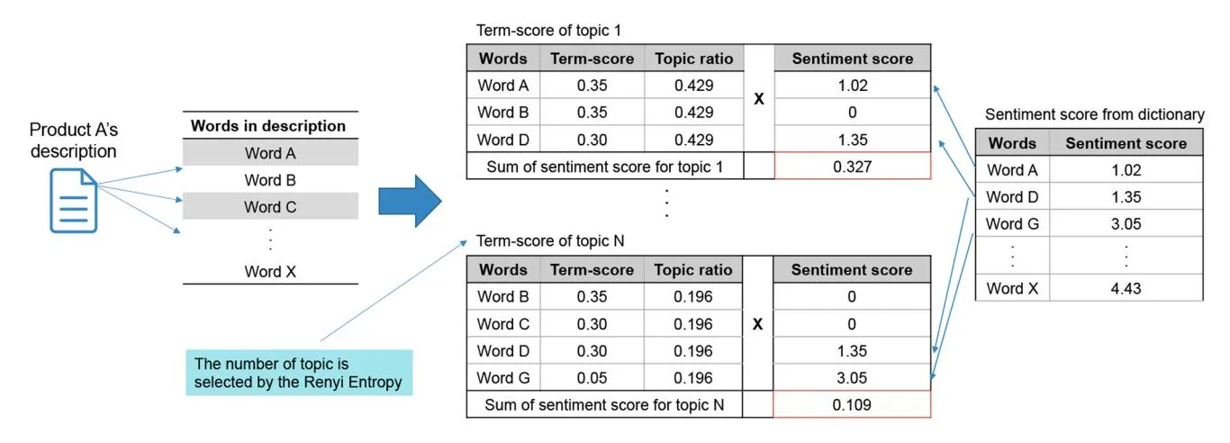 Japanese sentiment dictionary. This dictionary is then used to generate topics and assign them to each product description by calculating two distributions, one for the topic distribution. in each product description d, and the other for the distribution of words with a high probability for each topic t. This calculation is expressed as follows: