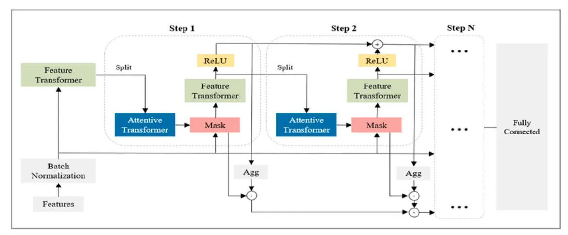 For each step, the feature transformer result is passed through the ReLU function, linearly combined, and the final predicted value is calculated using a fully connected layer. Feature transformer is made up of four layers of fully connected, batch normalization, and gated linear unit blocks. The first two layers are shared for mutually dependent semantic inference across all decision steps, while the last two layers allow for independent semantic inference across all decision steps. Fully connected, batch normalization, and sparsemax are the components of the attentive transformer. Sparsemax is a nonlinear normalization function that projects into a sparse space at each variable selection step to increase the scarcity of the mask. TabNet has a gradient boosting structure that complements the residuals. The attractive transformer loss function is as follows: