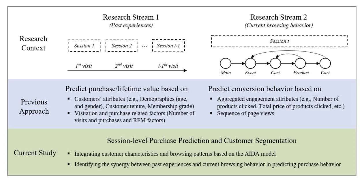 To address the practical and research gaps, our approach integrates both customer characteristics and browsing behavior, examining them through the lens of the customer decision journey, as illustrated in Fig. 1. While customer characteristics implicitly shape the purchase intention by influencing their overall journey preference, browsing behavior offers an explicit viewpoint as customers explore products. As depicted in Fig. 1, extant studies tend to isolate customer characteristics to predict subsequent purchase behavior and estimate customer lifetime value (CLV), relying on factors such as RFM [49], or focus solely on webpage navigation (i.e., clickstream) data to predict purchase behavior [26]. However, given that customers’ preferences and purchase intentions evolve from their past experiences and their onsite browsing behavior mirrors their immediate interests and desires, recognizing the synergy between past experiences and current browsing behavior becomes pivotal. This combined approach is not just theoretically significant but also enhances purchase predictions at the time of customer visit and customer segmentations in the e-commerce context.