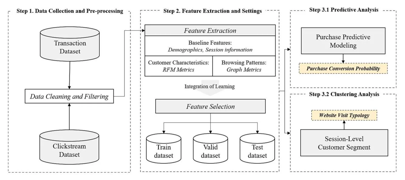 Section titled “3.1. Research procedure and context”This study consisted of three stages for session-level purchase prediction behavior and customer segmentation. Fig. 2 depicts a summary of our research procedure. In short, this study derives the purchase conversion probability through predictive analysis and session-level segmentations through clustering analysis to suggest personalized marketing strategies.