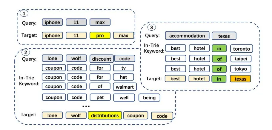 However, simply adding a Trie constraint to a natural language generation (NLG) model is not enough, and we found several common problems in daily use. The biggest problem of Trie-based generative retrieval model is that it cannot utilize global information. We list three examples in Figure 2. The first problem is that noise tokens will have a very low generation score thus lead to a wrong searching path. A second common problem is called “common prefix has no target object in the future tokens”, which implies that the entire beam search space is filled with common prefixes. Although these prefixes may compose good keywords, sometimes expected suffixes are not in the Trie to compose desired keywords. We cannot simply throw these sequences from beam search unfinished queue as these prefixes are really “common” and take a portion of good results. The last problem is that models are hard to decide which one is better when several tokens have similar high generation scores. For keywords extension, models have no idea which suffix will lead to desired keywords in a Trie.