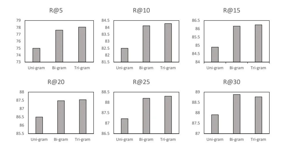 Firstly, we discuss the choice of n with Figure 4. Compared with the Uni-gram model, we obverse that looking ahead one future token significantly improves the results and the benefit of looking further is limited. It is due to the short length of target keywords. Most of the problems could be alleviated even with one token to look ahead. We can also see in the case study section4.5 that one length noise token is common for keywords extension. Thus we do not carry experiments for n ≥ 4.