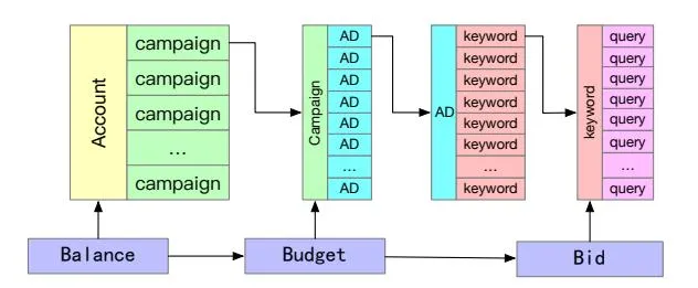 Taobao Search Advertising (TSA) is a suite of commercial advertising service 1 . Each advertiser maintains a treelike TSA account as shown in Fig. 1. The account has a balance and consists of several budget-limited marketing campaigns, while a campaign accommodates a set of ADs to be promoted. At the most fine-grained level, each AD