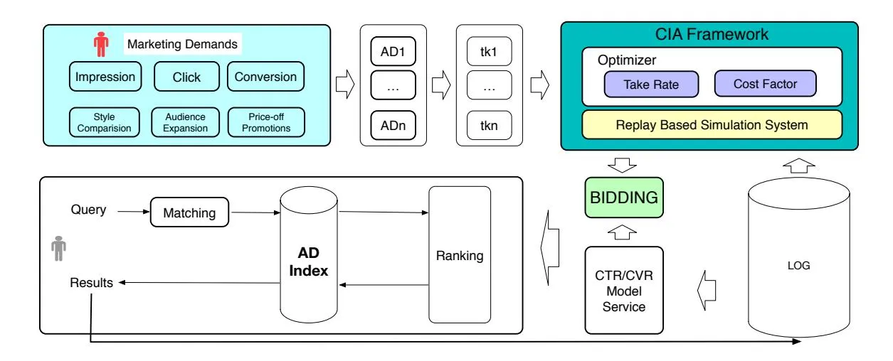 Section titled “Conclusion 7”In this paper, we propose a unified advertiser demands optimization framework called CIA in the e-commerce sponsored search. CIA formulates formally various demands with budget and unit conversion cost constraints. To maintain the advertiser knob on ROI, CIA constructs an impression-level bidding equation with tk, which bridges the advertiser’s keyword-level bids and the accepted ROI. Furthermore, to optimize campaign-level demands, CIA introduces an additional cost regulator to adjust AD-level tkand derives the constraint of virtual budget from the historical log. We find that under the GSP mechanism, CIA balances the benefits of three parties in sponsored search together, leading to a healthy marketing ecosystem. We illustrate the CIA optimization framework with two most representative demands as campaign-level GMV optimization and style comparison. A replay system is implemented to solve the optimization with knapsack algorithm or quadratic programming. Offline and online experimental results show that CIA provides a useful bidding strategy and is also qualified as an optimization framework for various demands.
