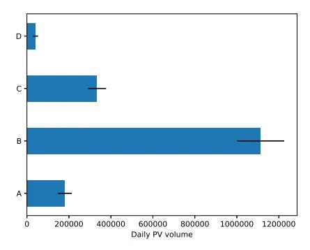 Figure 3: Auction volumes of four ADs across a week, where the length of the rectangular displays the mean and the line shows the standard deviation (A-Home Fabric, B-Cosmetics, C-Female Clothing, D-Office Furniture).