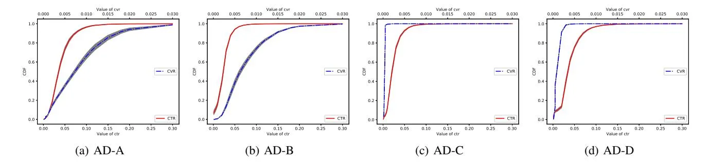 A historical auction log contains the contextual information of all the candidate ADs, bids, predicted ctr, cvr and commodity price etc. An asynchronous data collection system based on MaxCompute (Alibabacloud 2018) is designed to tackle the huge-volume streaming queries. For the replay-based prediction to be usable, the auction distribution of each AD should be relatively stationary. To justify the assumption, we chose four typical ADs to plot their daily auction statistics from Jan. 25, 2018 to Jan. 31, 2018 in Fig. 3. Furthermore, the corresponding cumulative CTR and CVR distributions are displayed in Fig. 4, which shows that CTR and CVR distributions are nearly the same for all the test ADs across the week. The two results together justify that the replay module is reliable enough to predict performance based on historical auction records.