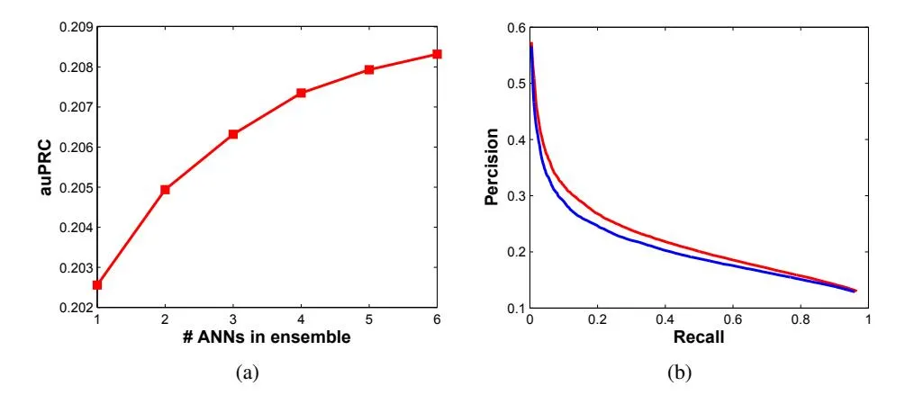 Figure 1: (a) Effect of increasing the number of ANNs in the ensemble on the auPRC. (b) Precisionrecall curves for LR (blue) and ensemble (red) show improvement in auPRC by using ensemble.