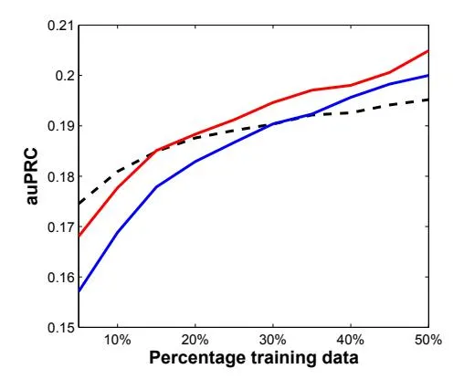 Figure 1(a) shows that performance improves steadily as we keep on increasing the number of ANNs in our ensemble. ANN models are added to the ensemble in the same order as they are listed in Table 1 (moving from top to bottom). In Table 2 we compare the performance of the ensemble and the best performing individual ANN with the LR results. We can observe that using ensemble improves the log likelihood by 0.24% and auPRC by 1.15% over the individual ANN. Figure 1(b) plots the precision-recall curves for the baseline LR and ensemble model. It clearly shows a visible improvement in auPRC for the ensemble.